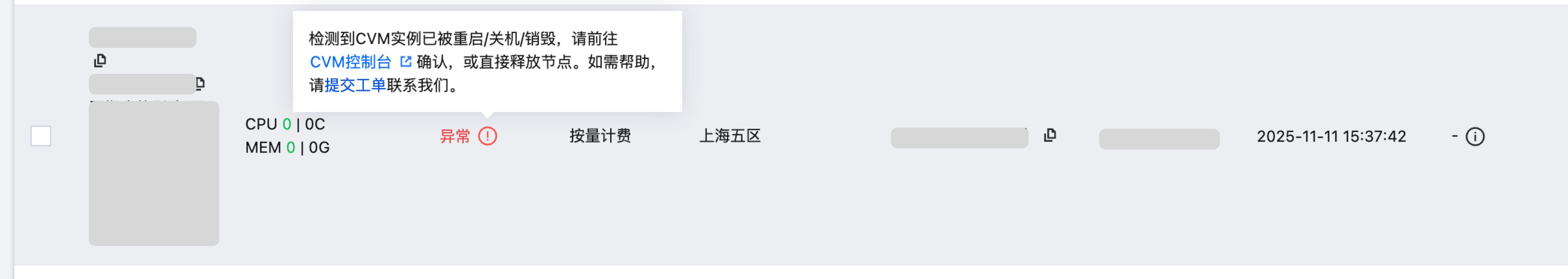 使用节点时 | 异常 | 节点未处于“Running”状态 | 由于用户主动在 CVM 控制台操作节点重启/关机,或节点已到期,导致节点不可用 |