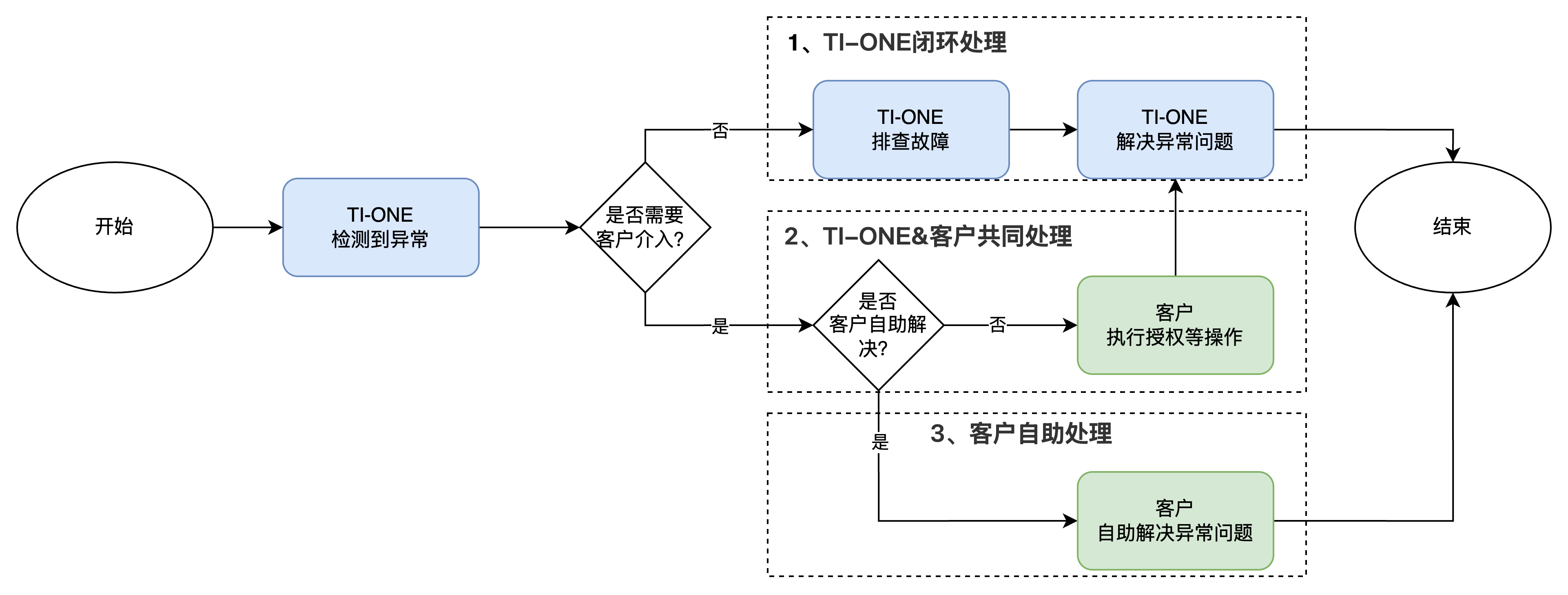TI-ONE & 用户共同处理 | 表示 TI-ONE 平台检测到异常后,通知用户介入,并指引用户完成某些操作后(如授权等),由TI-ONE排障解决。 | 已添加至资源组的节点由于CVM侧下发了维修任务,需要用户主动授权后,由 TI-ONE & CVM 恢复节点。 |