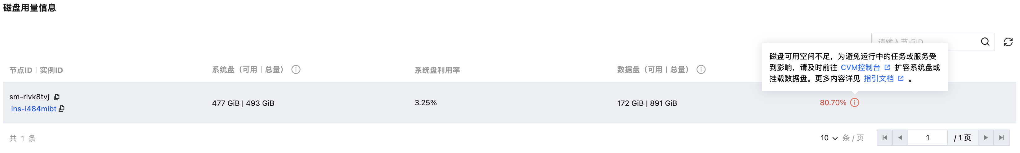 | 运行中 | 磁盘空间不足 | CVM 实例挂载的是系统盘或数据盘写满,导致 POD 无法启动,需要用户自助操作扩容 |