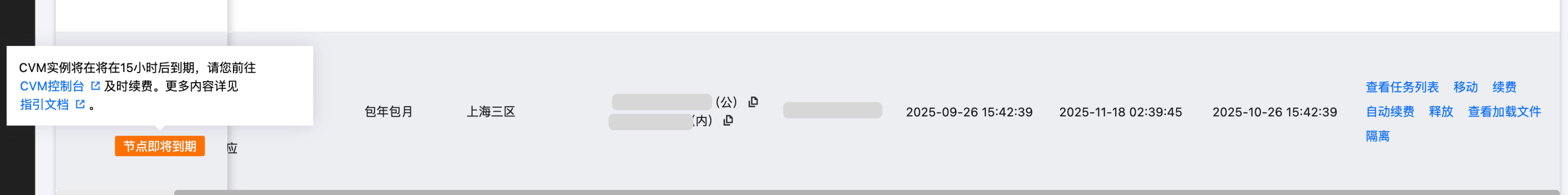 | 运行中 | 节点即将到期 | CVM 实例的算力费用即将到期,需要用户自助操作续费 TI-ONE 资源组节点的软件订阅费即将到期,需要用户自助操作续费 |