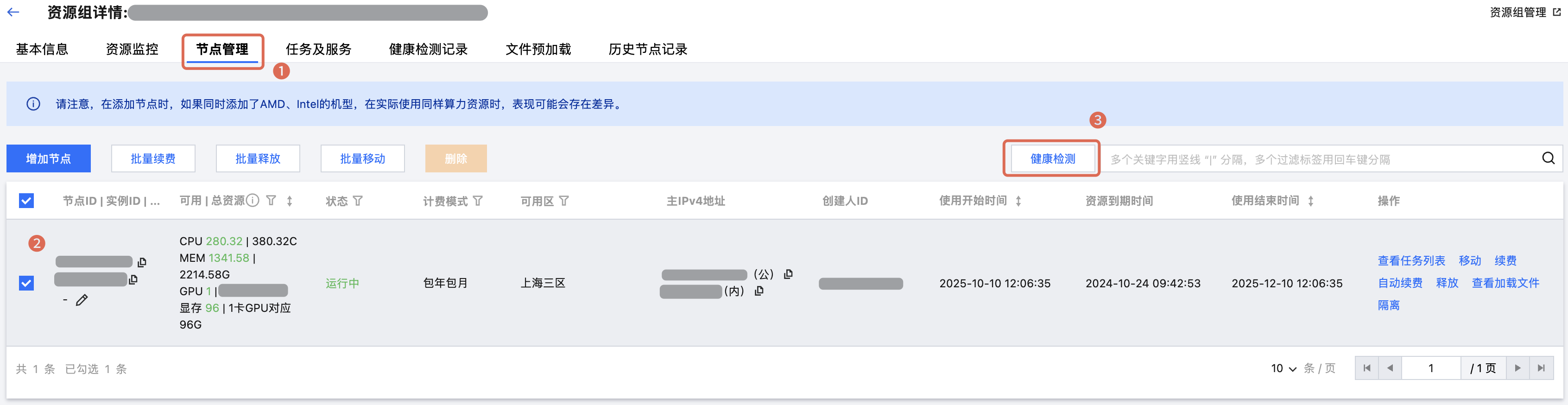 进入资源组详情页的“节点管理” tab 中,选择需要检测的节点范围,并单击右上角 健康检测 按钮。在弹窗内选择检测项后,即可完成创建。