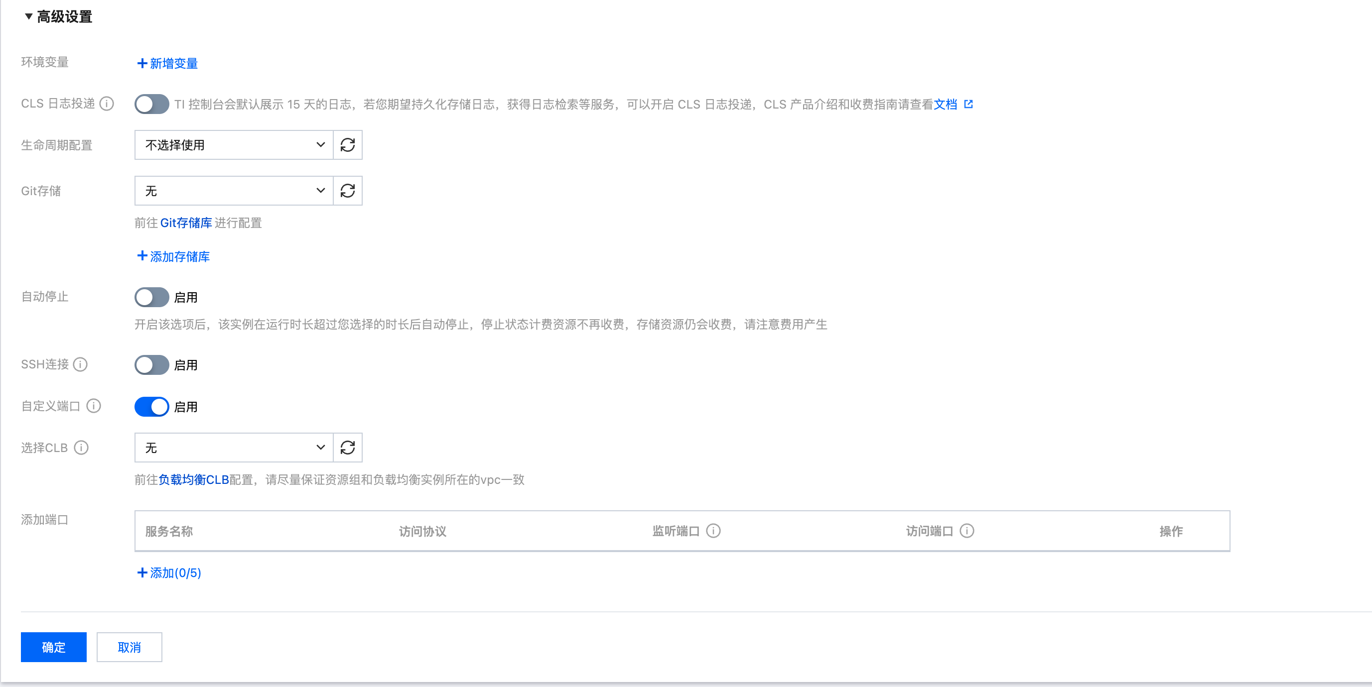 添加端口:若需要在外部访问开发机中启动的服务,可以启用自定义端口配置功能(当前仅支持当机器来源选择从 CVM 机器中选择):