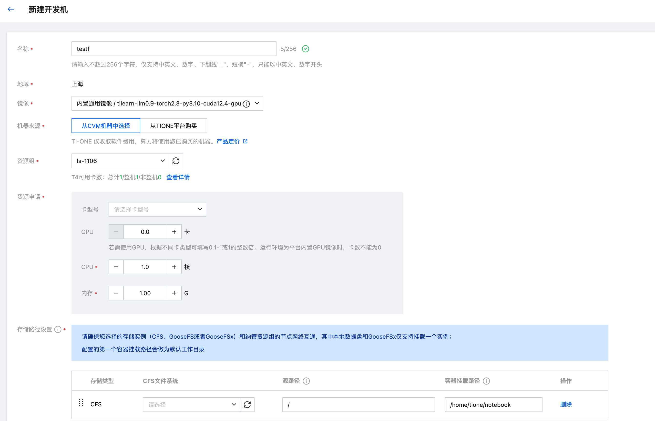 存储路径设置:可选择数据集、高性能云硬盘、SSD 云硬盘、CFS(包含 CFS Turbo) 文件系统和 GooseFSx 和 GooseFS。存储路径可配置多个,为了确保开发机实例可以正常使用,选择第一个存储路径会挂载到开发机的默认工作目录 /home/tione/notebook 下。