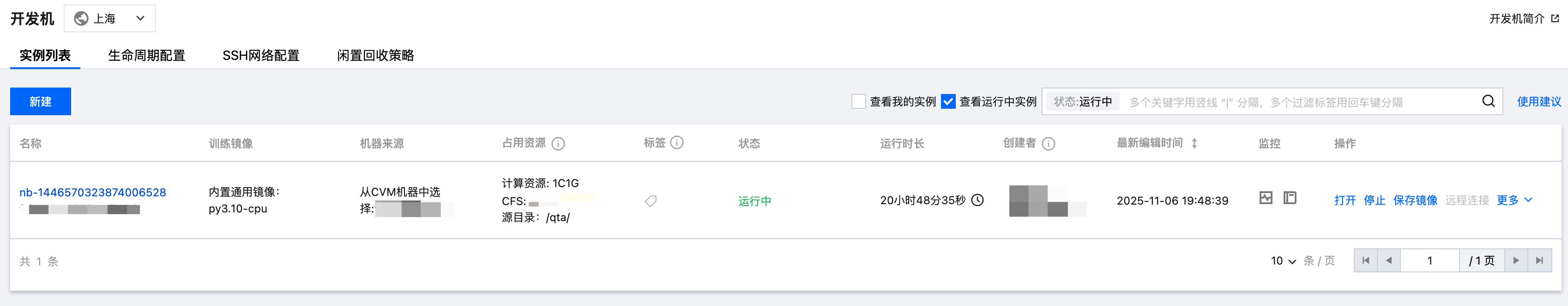 创建完成后,开发机列表中将新增一条实例记录。当实例“状态”由 启动中 变为 运行中 时,单击 打开 进入开发机实例内部。