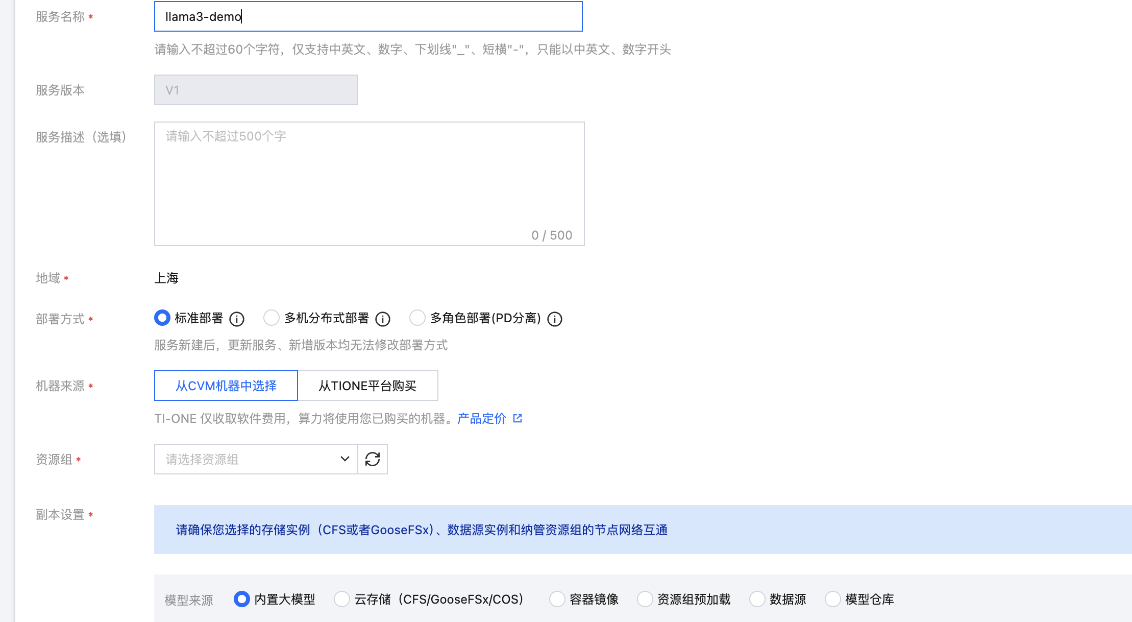 模型和运行环境:系统已为您内置默认填充了“内置大模型/Llama3系列模型/llama_3_8b_chat”,也可选择其他内置模型,如 Llama3 系列下的 llama_3_8b、llama_3_70b_chat、llama_3_70b 等。