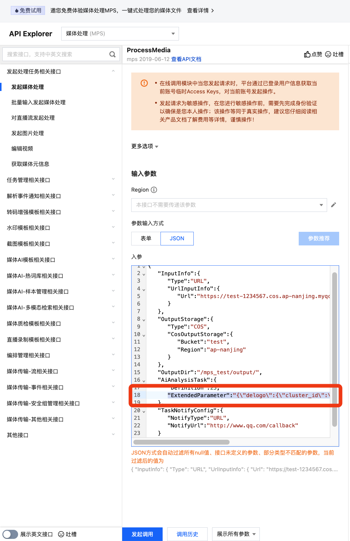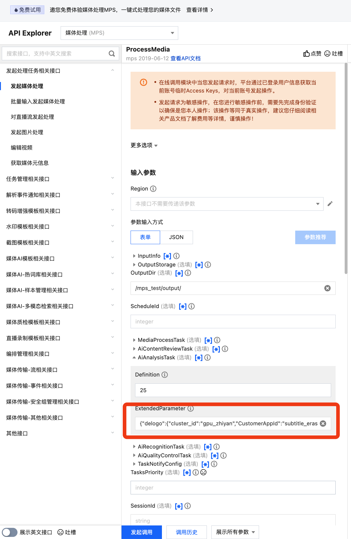 建议您通过 API Explorer 实现快速验证。您可以将上述 JSON 复制到 API Explorer 的 JSON 模式中,切换至“表单”模式可以自动解析,调整输入输出路径等必要参数后,再单击发起调用即可。
