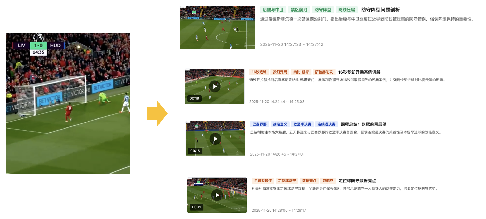 基于视频内容理解,自动识别并提取足球赛事视频中的关键行为事件,包括射门、进球、点球、红牌、黄牌、回放等关键行为事件。