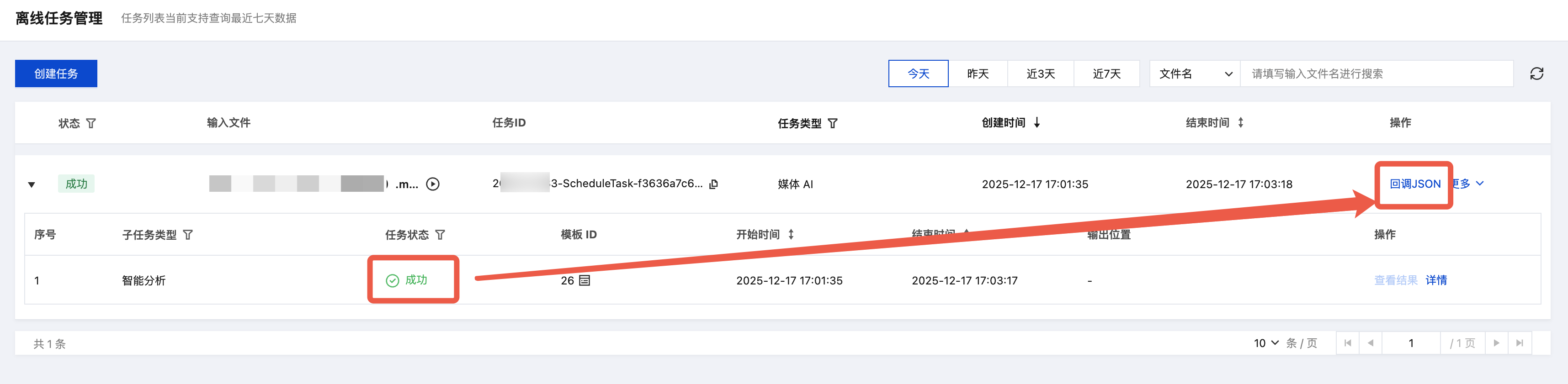 1. 您可以在控制台 任务管理 页面查看任务状态,当子任务状态为“成功”时: