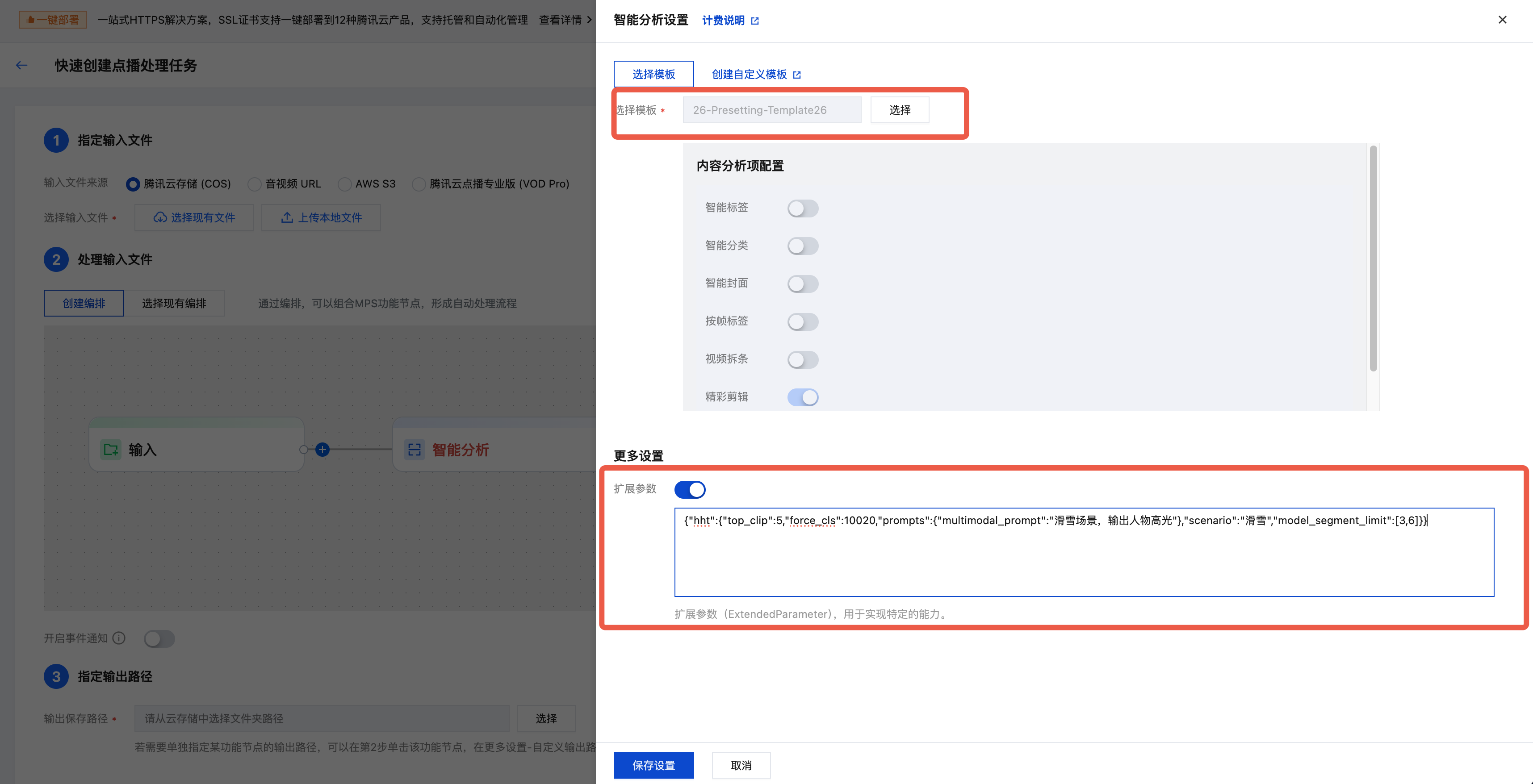 ExtendedParameter 需要对 JSON 字符串转义。下面为请求的参考范例:{"Url": "http://mps-pull.test.org/live/test.flv","TaskNotifyConfig": {"NotifyType": "URL","NotifyUrl": "http://test.cloud.com/callback"},"OutputStorage": {"Type": "COS","CosOutputStorage": {"Bucket": "my-mpsdata-12345xxx99","Region": "ap-guangzhou"}},"OutputDir": "/output/","AiAnalysisTask": {"Definition": 26,"ExtendedParameter": "{\\"hht\\":{\\"top_clip\\":10, \\"force_cls\\":5003, \\"need_vad\\":1, \\"threshold\\":0.9, \\"merge_time\\":60, \\"merge_type\\":0, \\"res_save_type\\":1}}"}}