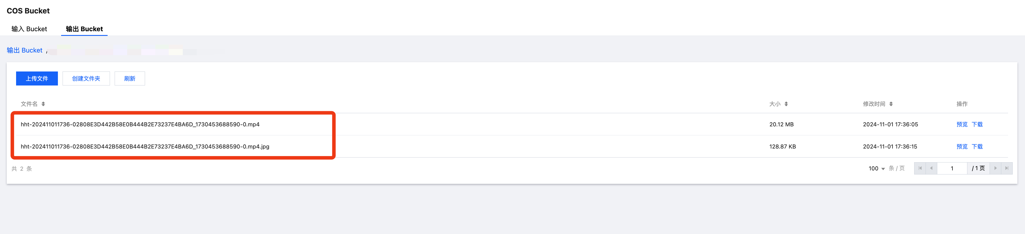 3. 如果使用 COS 作为输出路径,您可以在 MPS 控制台的 COS Bucket > 输出 Bucket 页面中找到您的输出目录,在目录下以