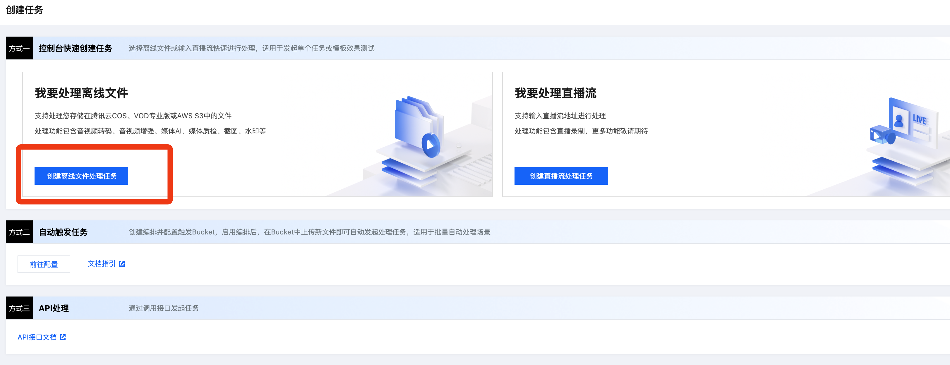 1. 进入 媒体处理控制台,依次点击创建任务 > 创建离线文件处理任务。