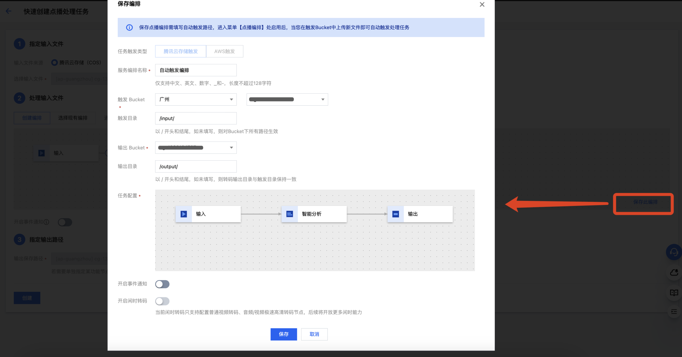 若您希望实现:在 COS 桶中上传了视频文件,并自动按照预设参数进行精彩集锦处理。您可以在创建任务时单击保存此编排,在弹出的窗口中配置触发Bucket、触发目录等参数。