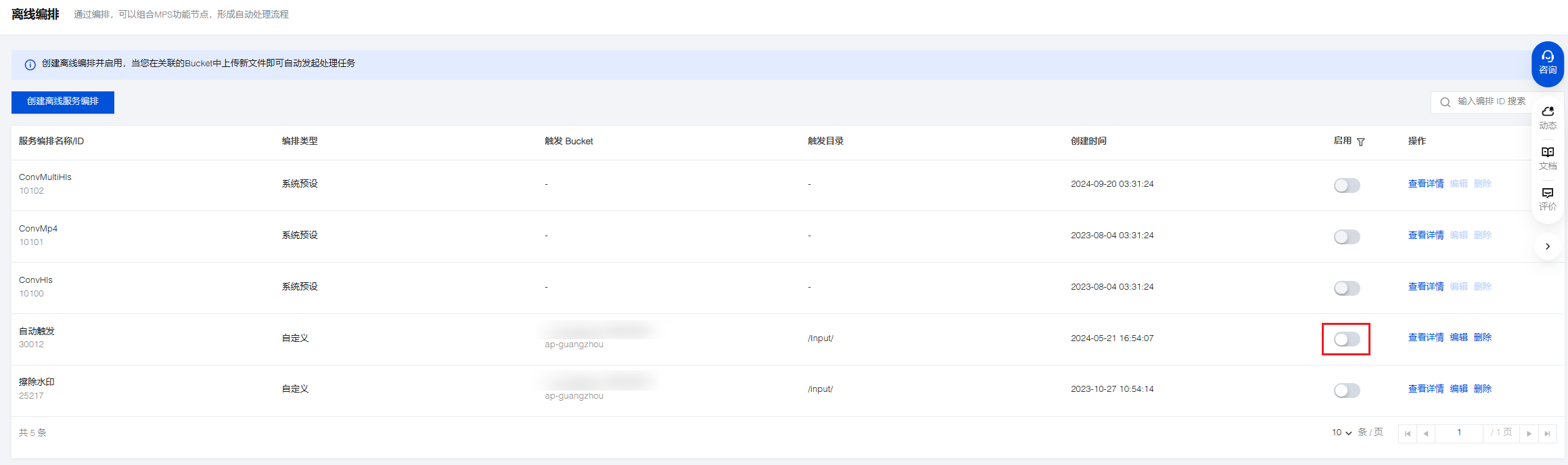 然后进入离线编排列表,找到刚创建好的编排,在启动处开启按钮即可。后续在触发目录下新增的视频文件,将自动按照该编排预设的流程和参数发起任务,并将处理后的视频文件保存到编排配置的输出路径中。
