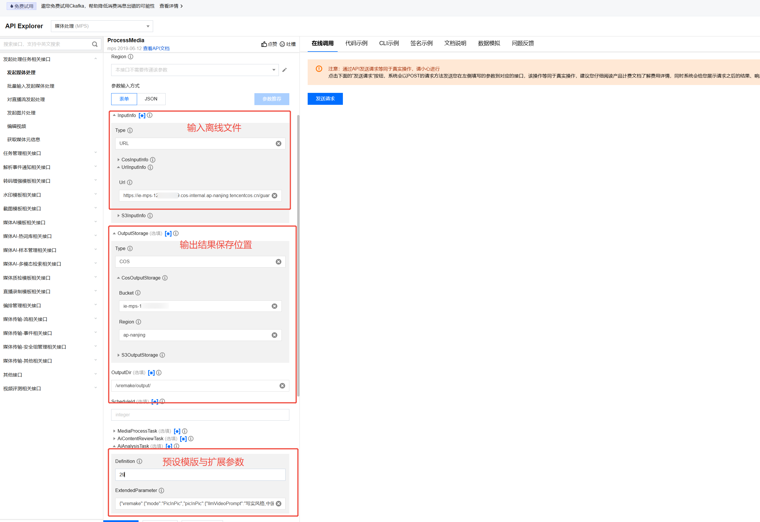 1. 进入媒体处理 API Explorer 在线调试页面,选择“媒体处理”产品,在左侧接口列表选择 发起媒体处理 接口。