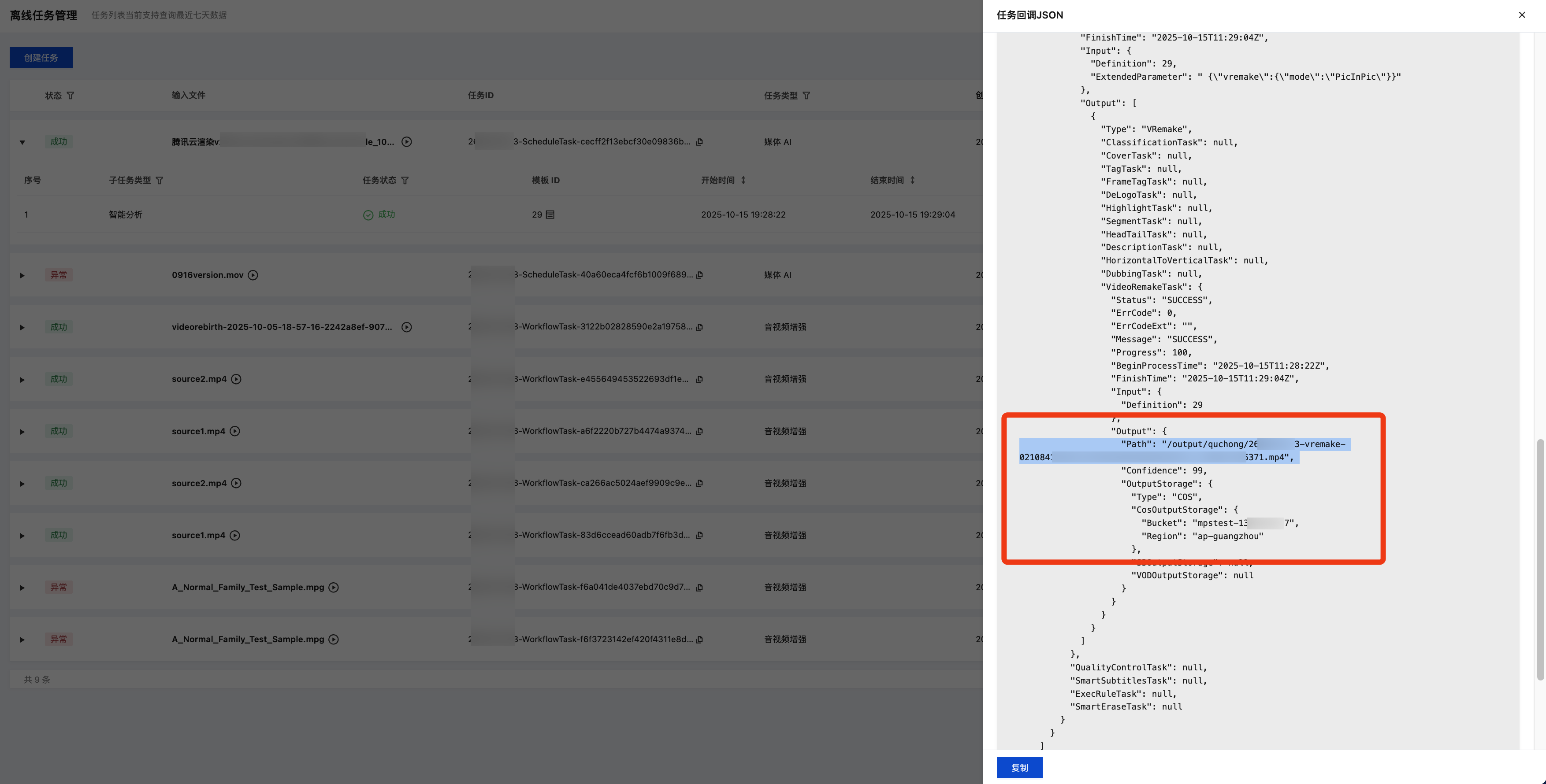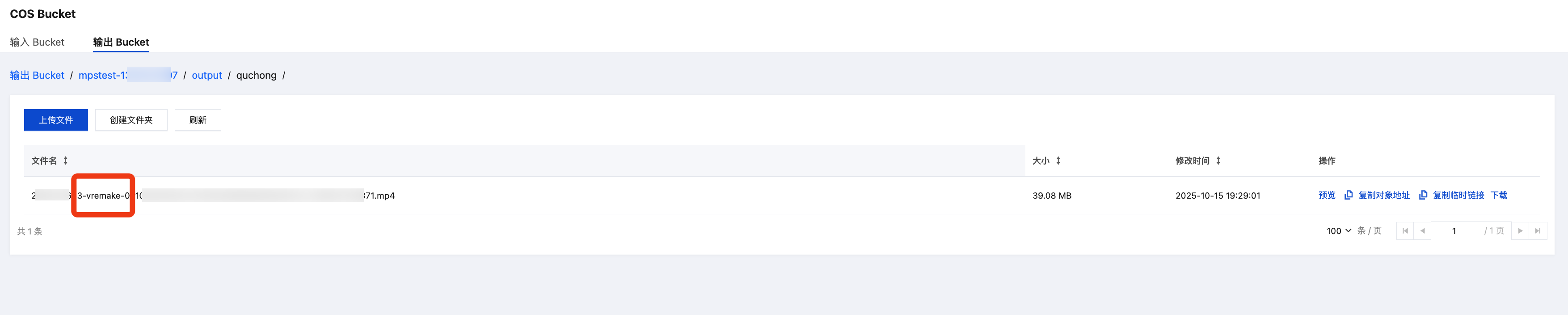 3. 如果使用 COS 作为输出路径,您可以在 MPS 控制台的 COS Bucket > 输出 Bucket 页面中找到输出文件。文件名类似"12345-vremake-12345asdfg_123456789.mp4"的视频即为去重处理后的视频文件。