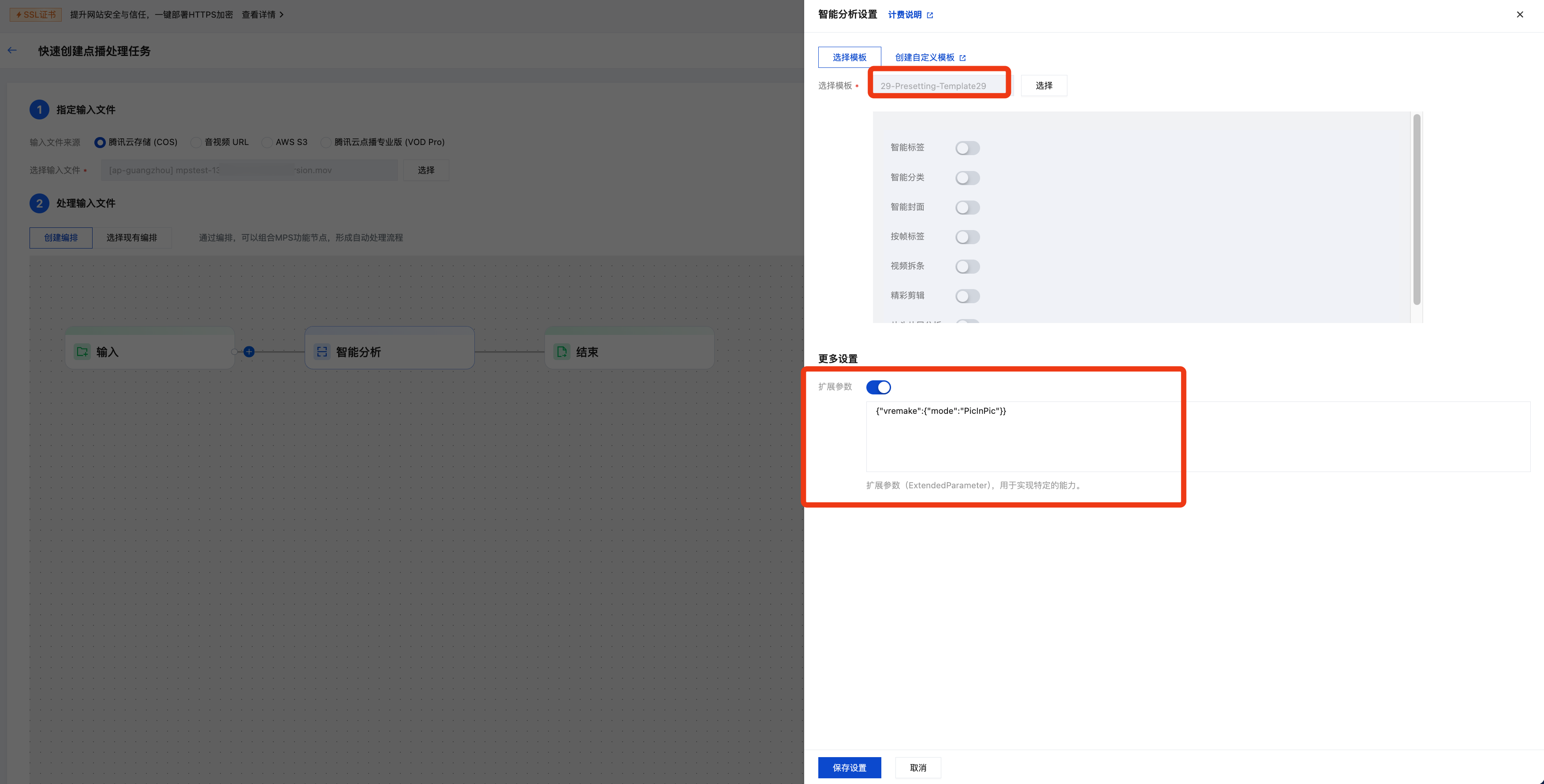 {"InputInfo": {"Type": "URL","UrlInputInfo": {"Url": "https://mps-123***789.cos-internal.ap-guangzhou.tencentcos.cn/test/hht_test/MyStoryForYouEP39.mp4"}},"OutputStorage": {"Type": "COS","CosOutputStorage": {"Bucket": "mps-123***789","Region": "ap-guangzhou"}},"OutputDir": "/test_data/","AiAnalysisTask": {"Definition": 29,"ExtendedParameter": "{\\"vremake\\":{\\"mode\\":\\"PicInPic\\"}}"}}