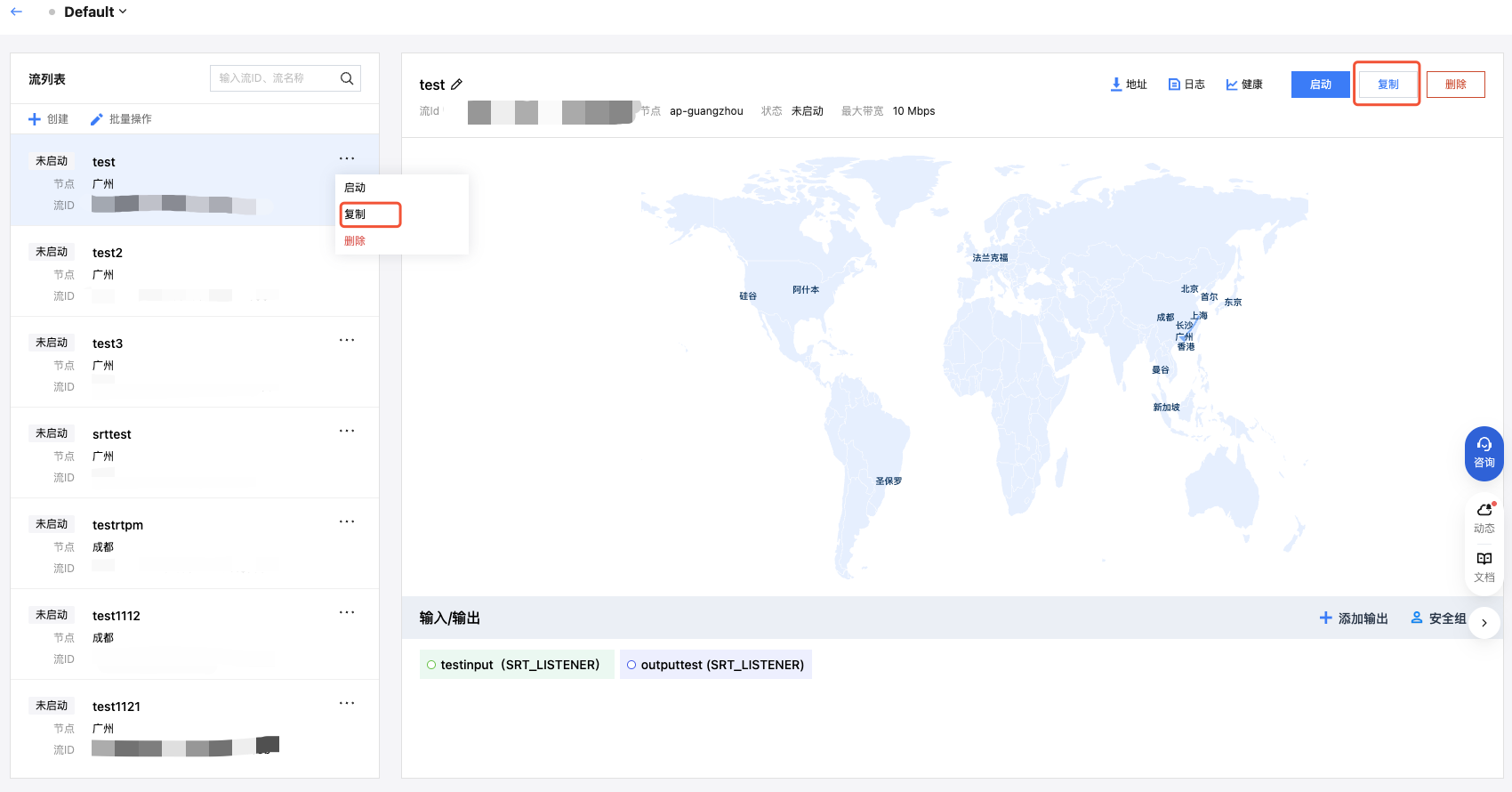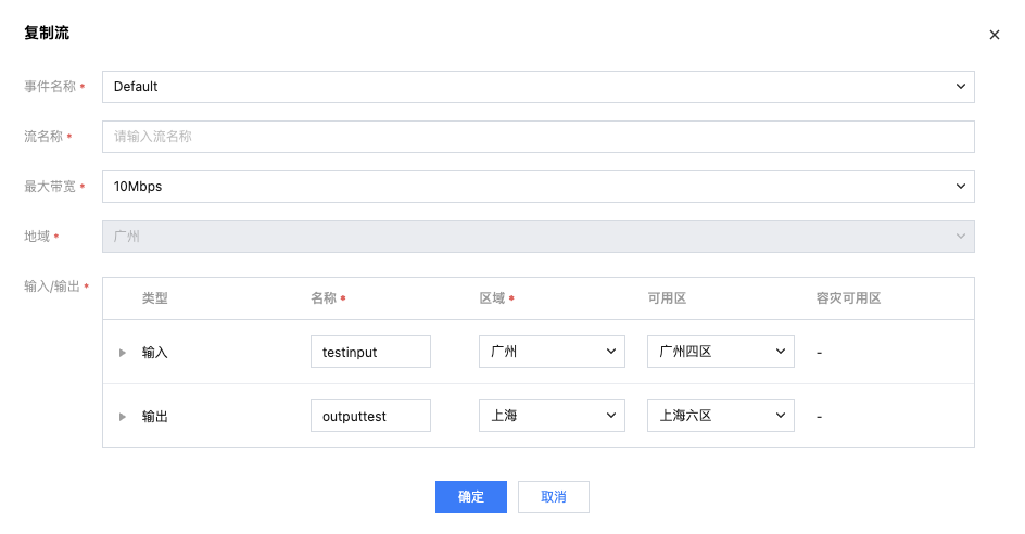 3. 在复制功能中,可以重新设置新流的事件名称、流名称、最大带宽、Input 名称、Input 地域、Input 可用区、Output 名称、Output 地域、Output 可用区。其它信息不能进行设置,会默认与原流一致。