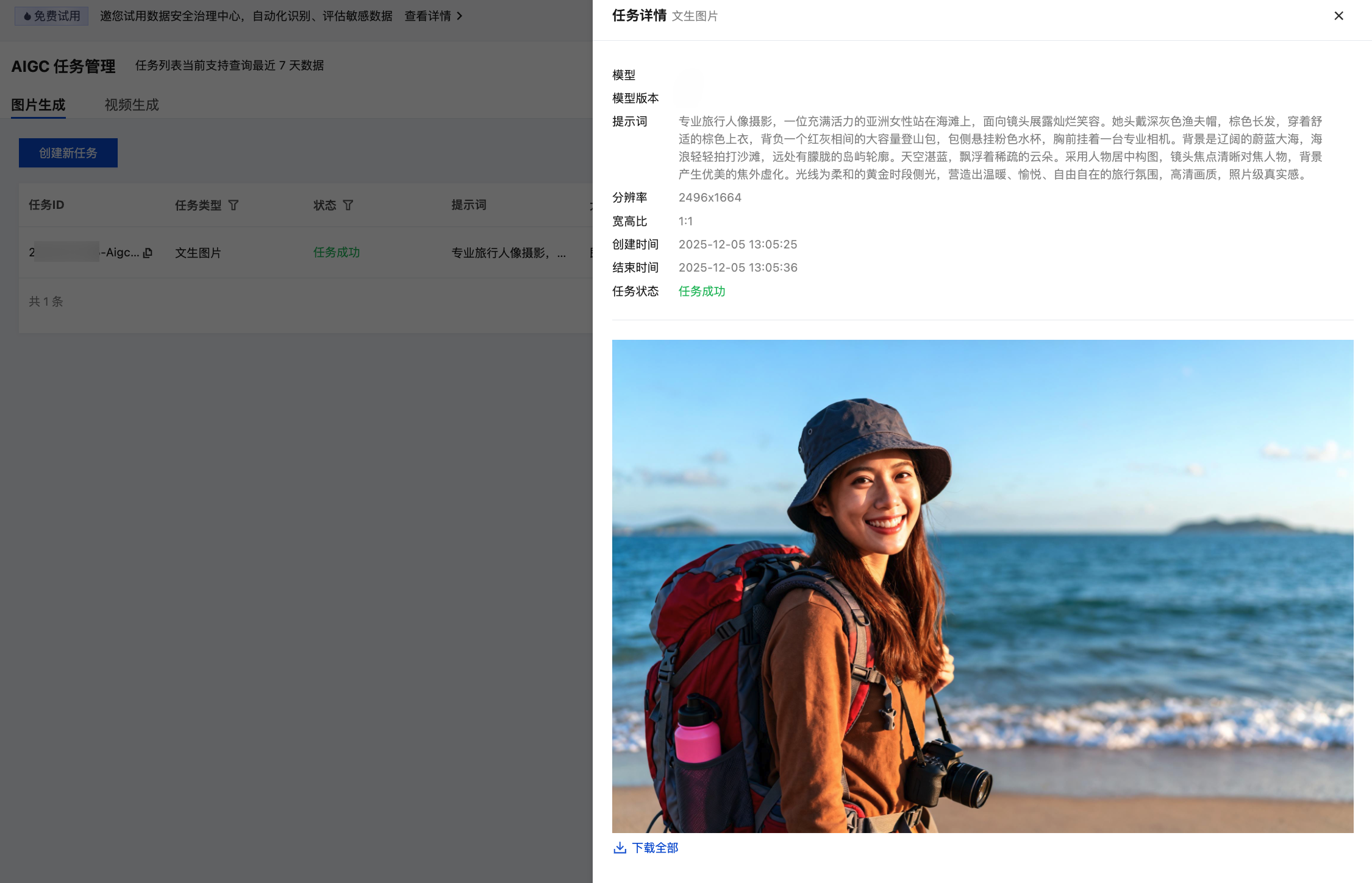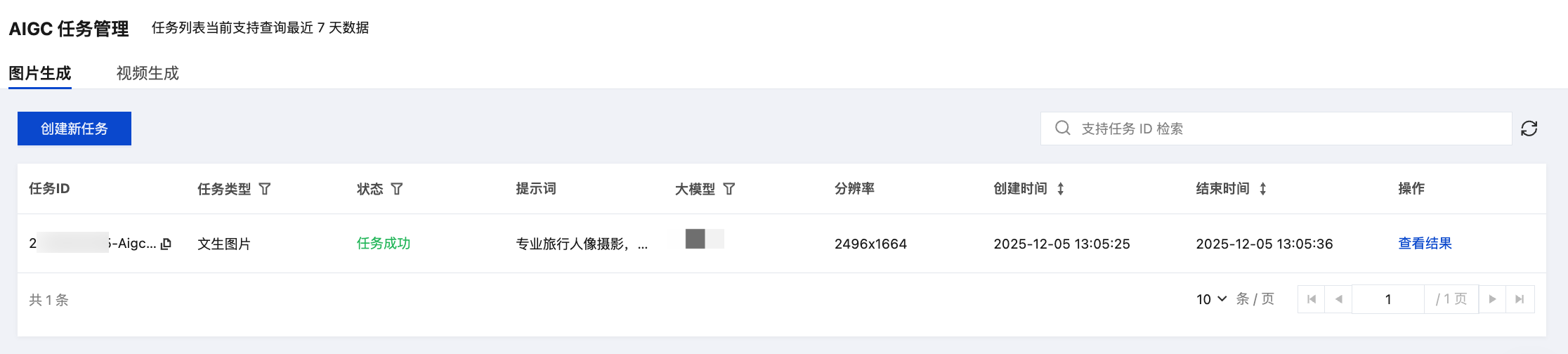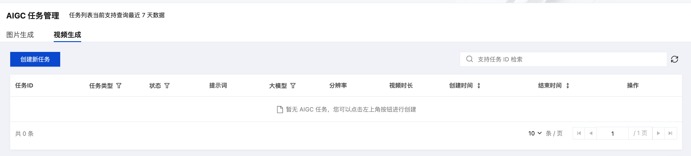 1. AIGC 任务列表 包含“图片生成”和“视频生成”两个独立列表。