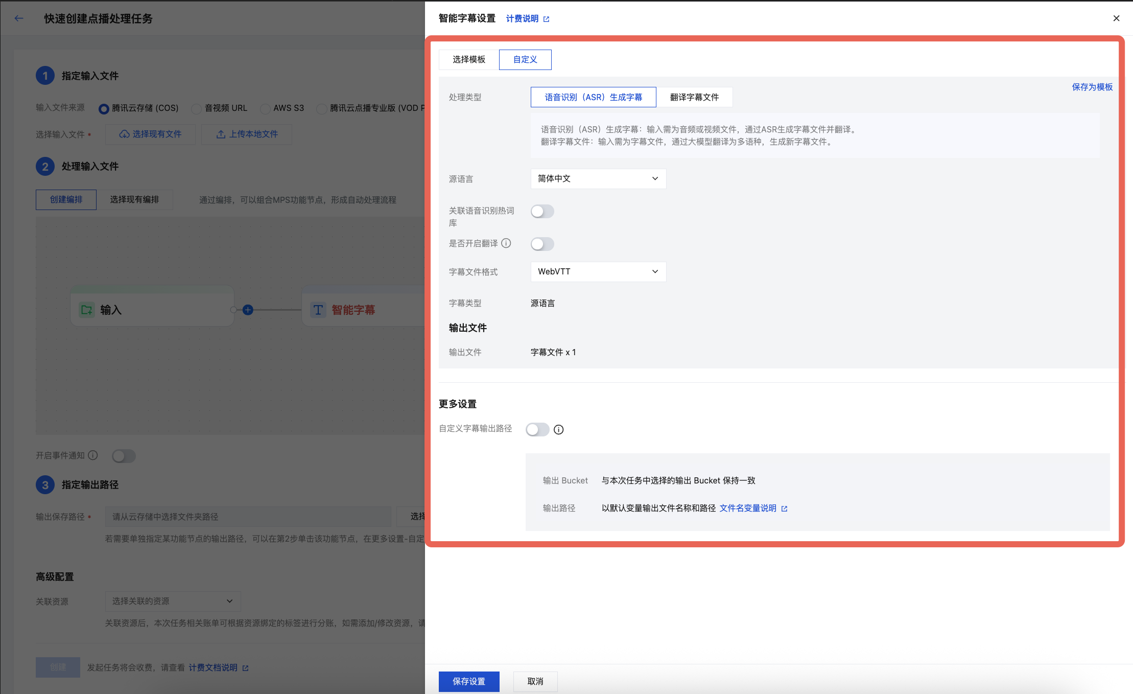 处理类型为“语音识别(ASR)生成字幕”,支持以下源语言和翻译目标语言