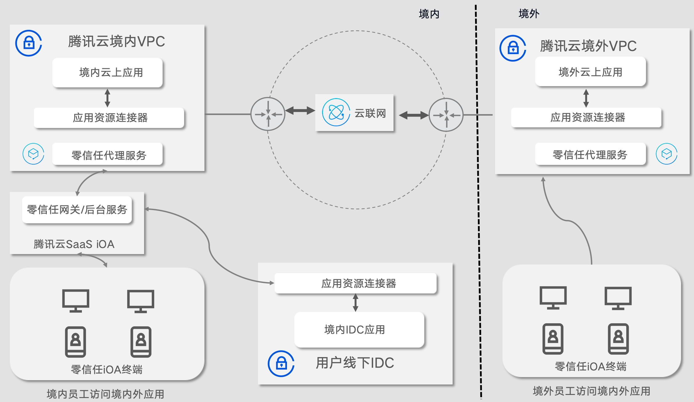 在境内外腾讯云 VPC 创建 CVM,部署零信任 iOA 代理服务,在境内外应用所在 VPC/IDC 部署资源连接器并通过零信任控制台发布需要访问的应用;创建云联网实例,将境内外代理服务所在的 VPC 加入到云联网实例中。