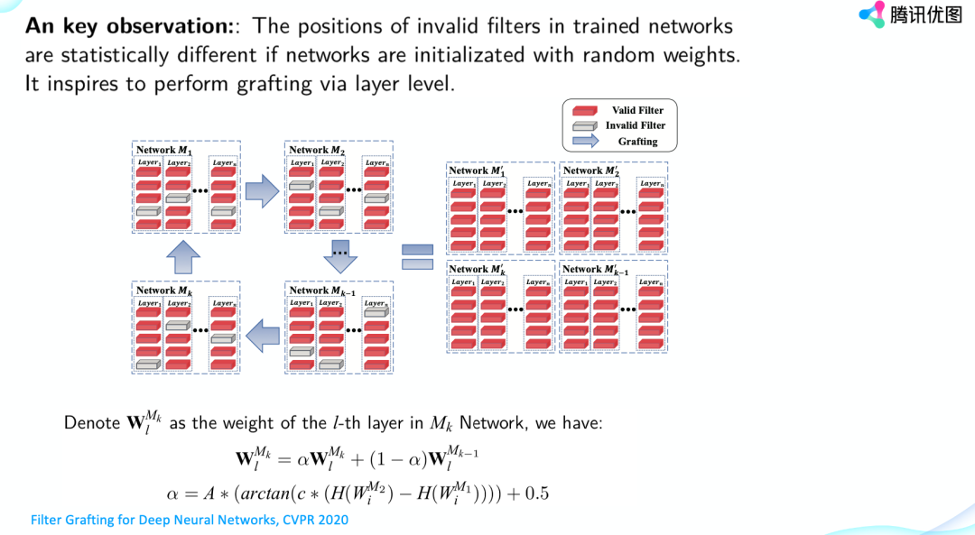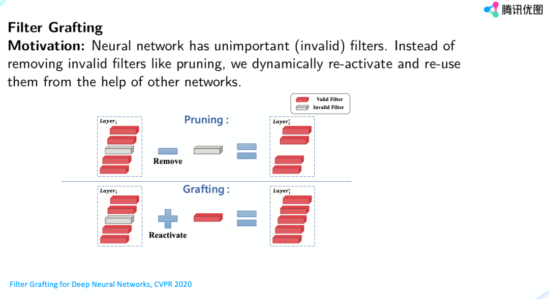 时间再拉近一点,这是今年腾讯优图中稿CVPR2020年的一篇文章,叫做Filter Grafting。这篇文章的motivation是什么呢?我们知道训练好的神经网络存在很多冗余或者说无效的filter,比如说l1 norm很低,那Pruning就是想把这些filter给移除掉来加速网络的推理能力。那么我们想,如果我们不把这些无效的filter移除掉,而是通过其他网络的帮助来激活这些无效的filter,让它们重新变得有价值起来,那是不是可以进一步提高网络的表达能力?
