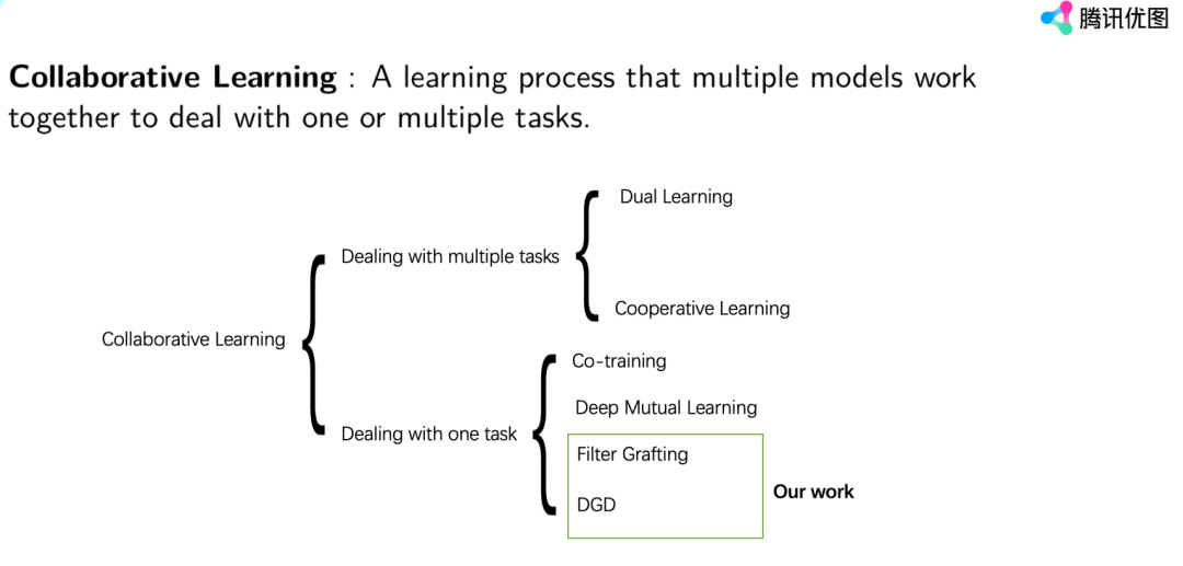 按照任务分,协作学习可以分成两个:一个是解决多个任务,有Dual Learning和Cooperative Learning;一个是多个模型一起协作解决一个任务。因为dual learning和cooperative learning主要是解决自然语言处理的问题,自然语言处理涉及到比如说中文翻译成英文,英文翻译成中文,这是多个任务。我们这里主要是讲CV方面,所以说我们主要讲解决一个任务,接下来会介绍Co-training、Deep Mutual Learning、Filter Grafting和DGD这几个工作。