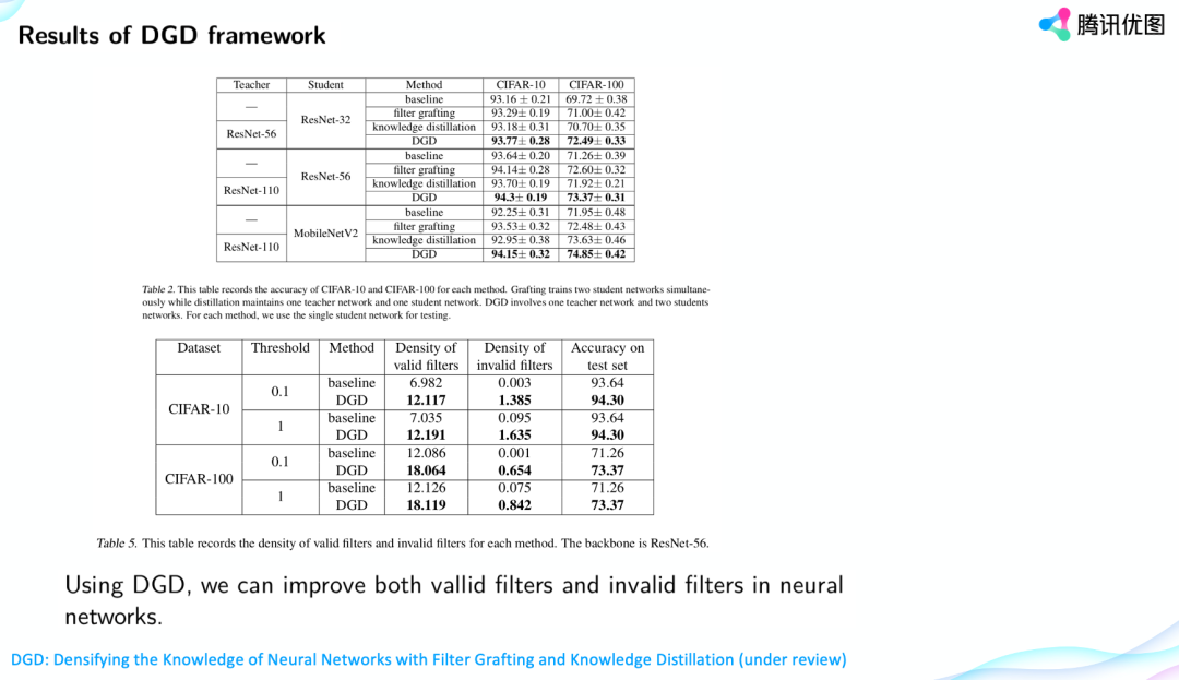 看一下DGD framework的结果。我们对比了传统的filter grafting,还有knowledge distillation,发现比grafting,distillation都有不错的提升,比如在CIFAR-100上,各个网络基本都会比baseline提升两到三个点。