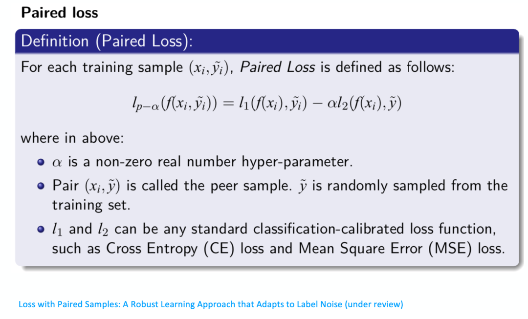 把时间往前推进一下,讲一些目前正在审稿中的文章,关于Peer loss。我们构造的时候它等于两个loss的加权,α是权重系数,衡量l1和l2的大小关系,Xi和Y ̃是样本和对应的label。