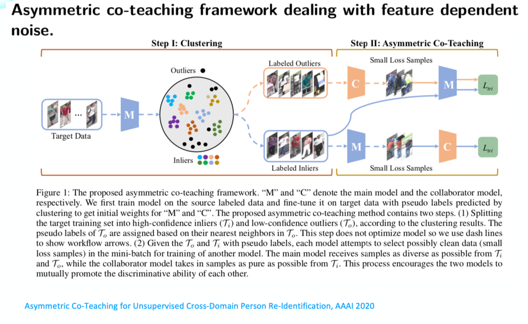 腾讯优图提出了一个框架,叫Asymmetric Co-teaching。因为聚类中存在inlier和outliers,这两个不同源,所以用非对称的思想去解决noise label的问题。