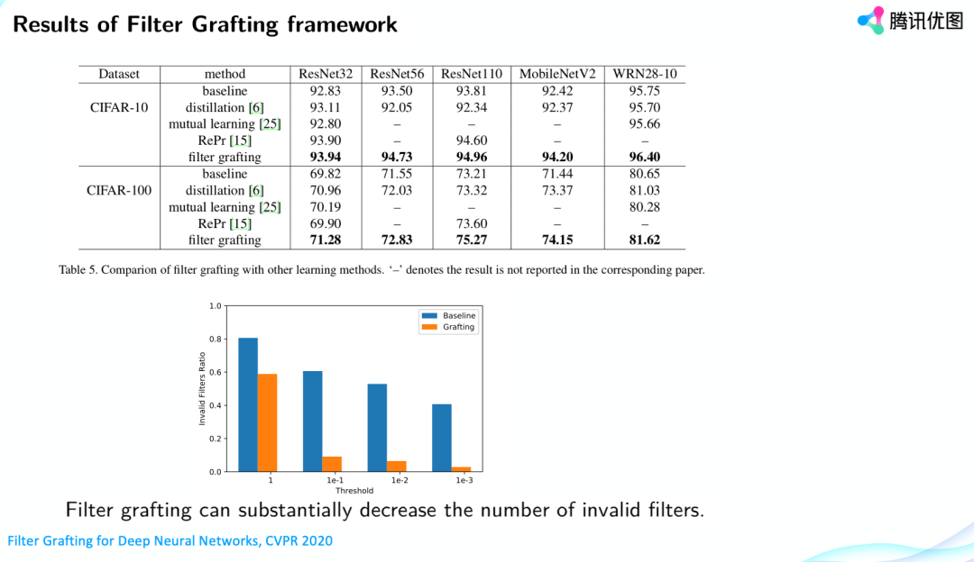 可以看一下这个结果,对于在CIFAR-10、CIFAR-100上进行的实验,与mutual learning、传统的distillation、还有RePr相比较,Filter Grafting效果还是不错的,对于一些大网络,特别是对于CIFAR-100有两个点的提升。