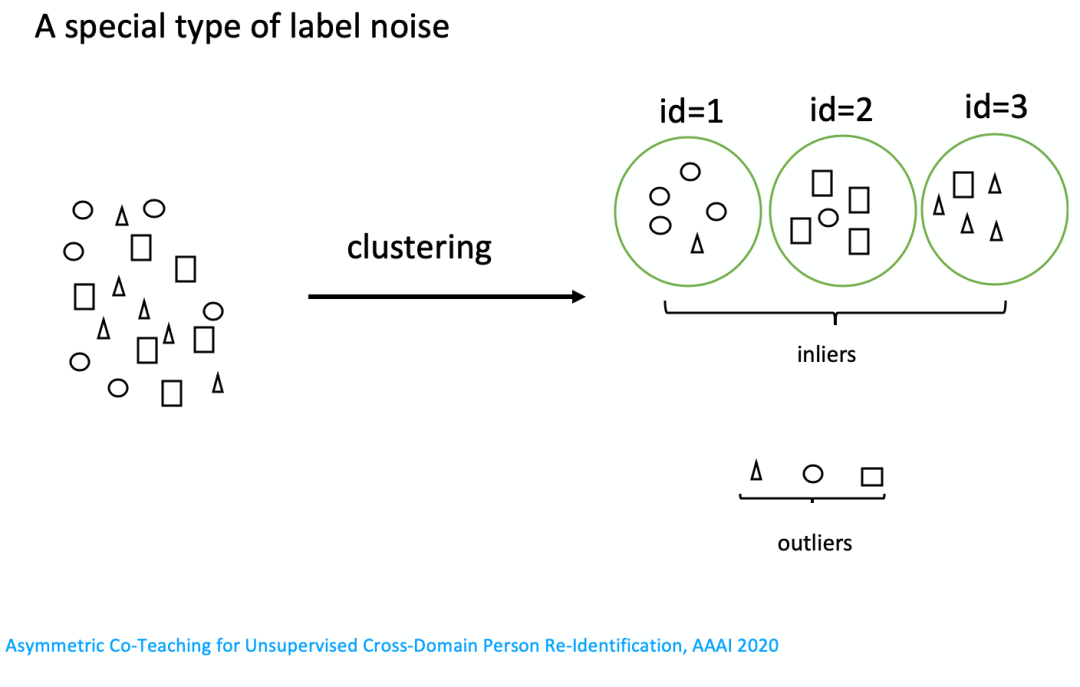 接下来介绍腾讯优图在2019年底发表的一篇文章,解决一类特殊的label noise。这类label noise不是人为标注产生的,而是在训练中产生的。比如说有这样一批没有标记的样本,然后通过一个聚类算法得到inliers和outliers,outliers是聚类算法中认为这一点是孤立点或者是噪音点,它没法归到聚类算法的ID里面,就叫做outliers;inliers是聚类算法对这些样本进行聚类后得到一个个id,但每一个id里面可能存在noise,比如说对于id1里面有一个三角,这个三角更应该是id3里面的样本。它是在模型的聚类过程中产生,所以说这是一类特殊的noise type。
