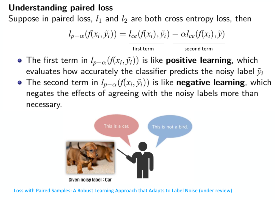 为什么peer loss可以很好地解决noisy labels问题?为了方便,这里先把l1、l2都定义成CE loss,那么在第一项,它表现的像positive learning,因为它就是一个传统的CE function,而在第二项,它像 negative learning,也就是在标记错的时候,比如把狗标成汽车,如果用positive learning进行学习的话那就出现问题了,它是随机从一个label中进行抽取,希望让模型学到它不是一个鸟,狗不是一个鸟,它的语义关系首先是成立的,是正确的,这样一来,第二项对模型也能起到一个积极的导向作用。