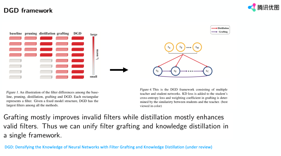 这篇还在审稿中的文章是关于我们的新发现,就是传统的蒸馏可以解决有效filter信息量可能减少这个问题,这是这篇文章的贡献。我们提出了DGD的training framework。