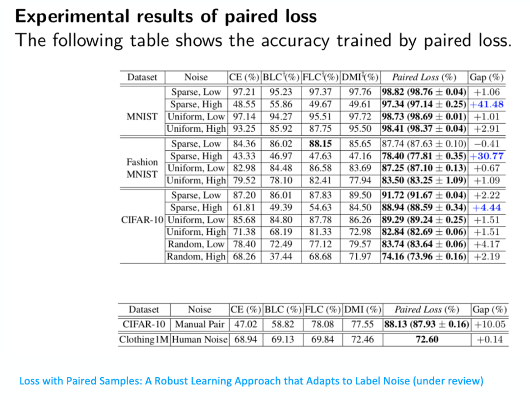 再看一下数值的实验结果。我们在MNIST、Fashion MNIST、CIFAR-10上进行了实验,可以看到MNIST和Fashion MNIST上,用peer loss优化的结果超过了一些其他的结果,包括DMI的结果三四十个点,这是非常大的进步。在CIFAR-10上也超过将近5个点,四个多点左右这样的一个结果。而且,我们发现peer loss尤其对Sparse,High这种noise type表现得特别明显。