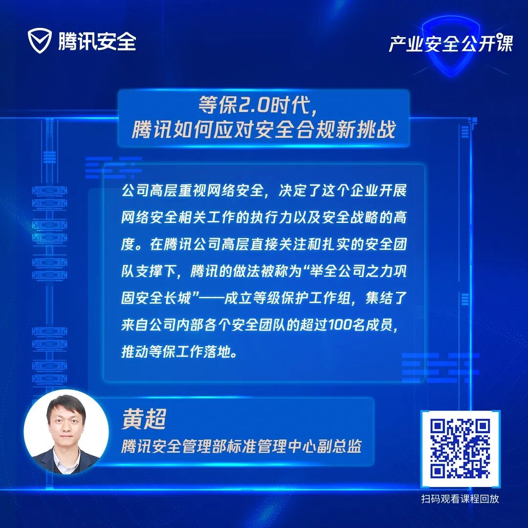尤其是深度接入互联网技术的大型公司,他们的过保经验尤为珍贵。作为一家拥有超过6万名员工、100+业务线的企业而言,腾讯这种体量的企业是如何过等保的?腾讯安全管理部标准管理中心副总监黄超带来的《等保2.0时代,腾讯如何应对安全合规新挑战》,就分享了腾讯与等级保护幕后故事和一手的实践干货。