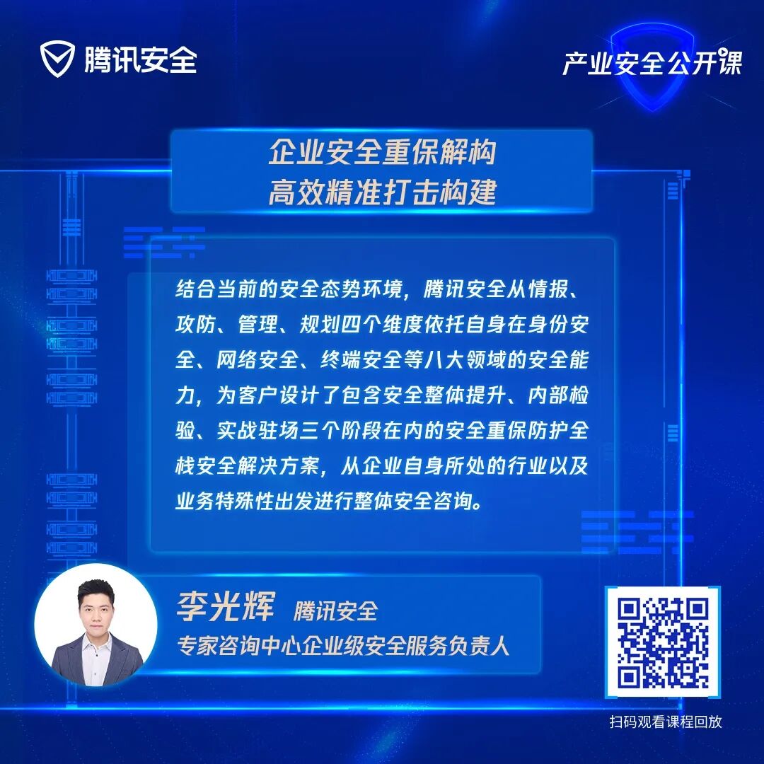 产业安全公开课·等保2.0专场第五课,腾讯安全专家咨询中心企业级安全服务负责人李光辉以《企业安全重保解构,高效精准打击构建》为题,结合当前的安全态势环境,解析企业面临的通用安全问题,并分享了腾讯安全在金融、泛互等行业领域的重保护航最佳实践。