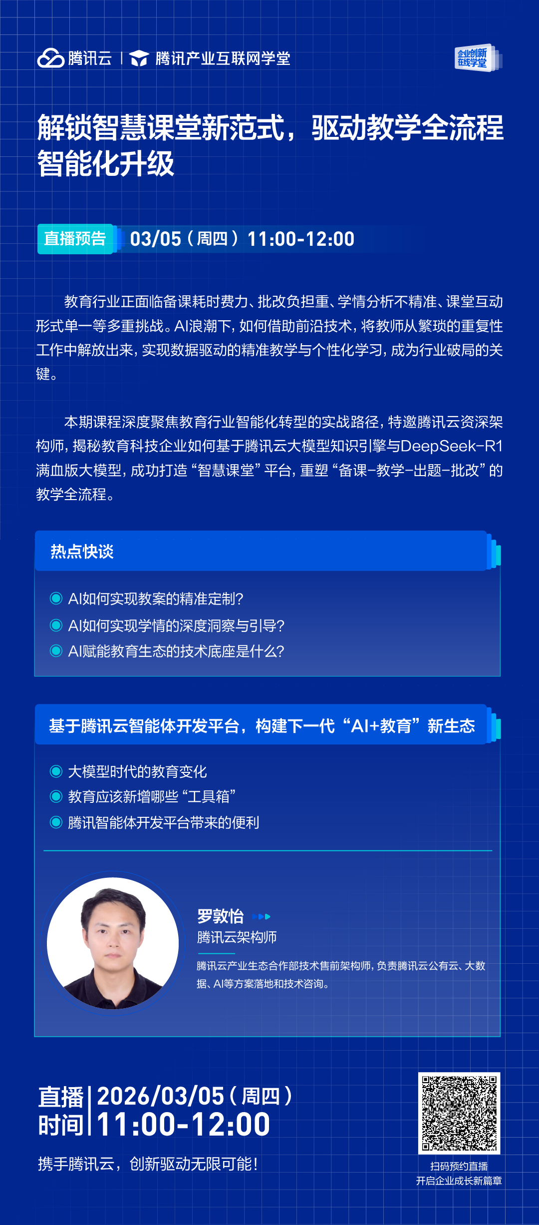 教育行业正面临备课耗时费力、批改负担重、学情分析不精准、课堂互动形式单一等多重挑战。AI浪潮下,如何借助前沿技术,将教师从繁琐的重复性工作中解放出来,实现数据驱动的精准教学与个性化学习,成为行业破局的关键。本期课程深度聚焦教育行业智能化转型的实战路径,特邀腾讯云资深架构师,揭秘教育科技企业如何基于腾讯云大模型知识引擎与DeepSeek-R1满血版大模型,成功打造“智慧课堂”平台,重塑“备课-教学-出题-批改”的教学全流程。