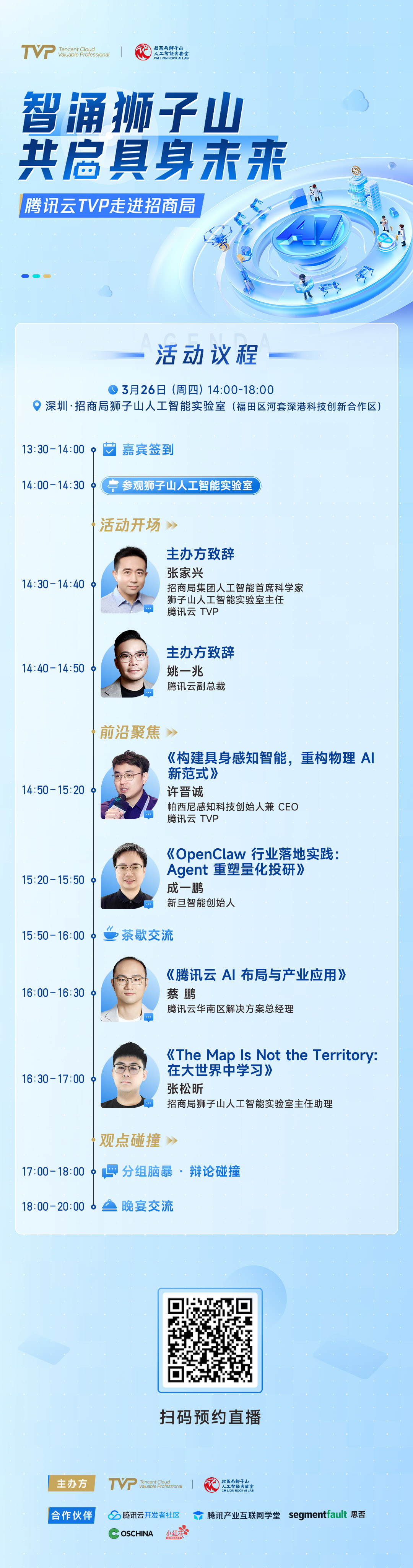✅3月26日(周四),「智涌狮子山,共启具身未来」——腾讯云 TVP 走进招商局,特邀行业顶尖专家,围绕具身感知智能重构、OpenClaw 行业落地实践等核心议题,展开深度分享与思想碰撞,共同探索 AI 从"虚拟智能"走向"具身未来"的技术演进方向与产业变革新图景。
