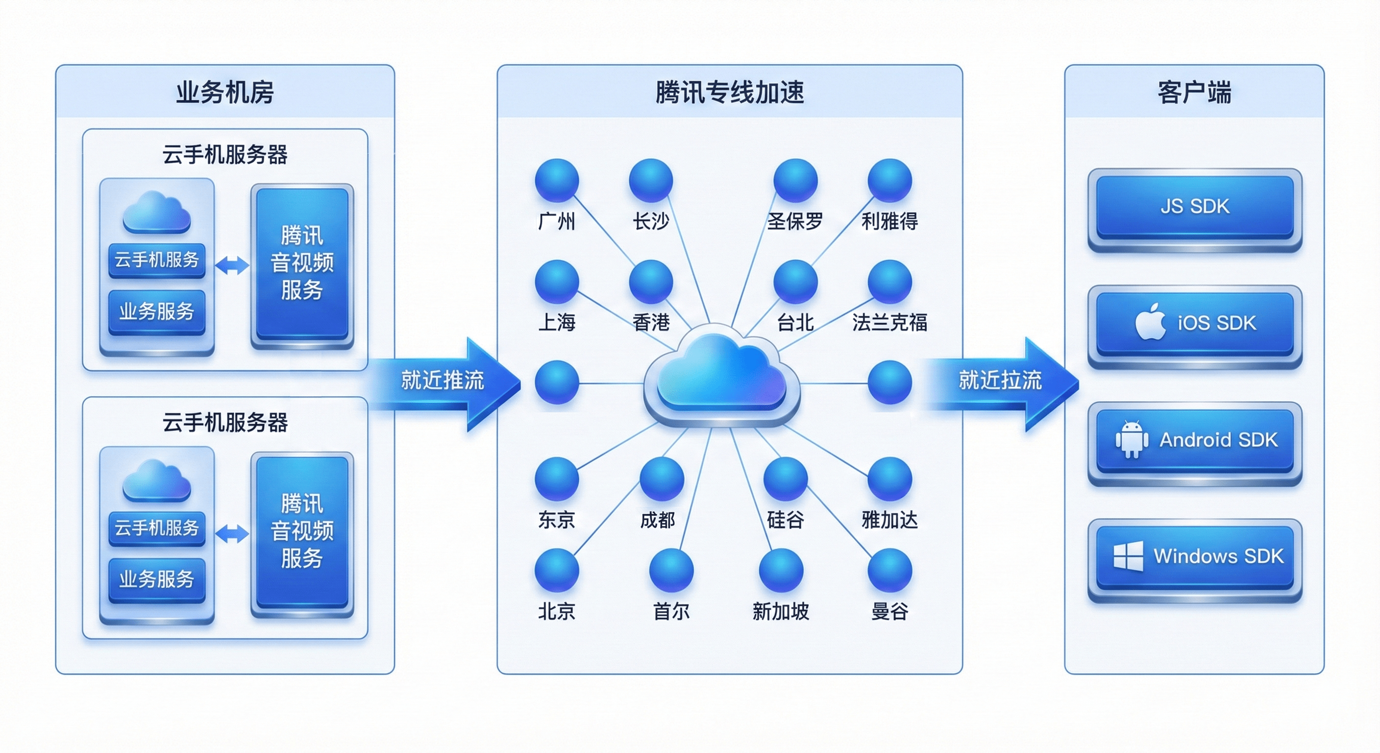 云手机提供一站式音视频串流能力,覆盖采集、编码、串流传输、解码渲染完整链路,不仅满足自身云手机资源使用,也支持被集成到第三方平台,降低多云机供应商的平台管理成本。依托腾讯云音视频能力和优质的专线网络,资源覆盖全球16个主要业务地区,实现一次接入,全球加速的优质体验。