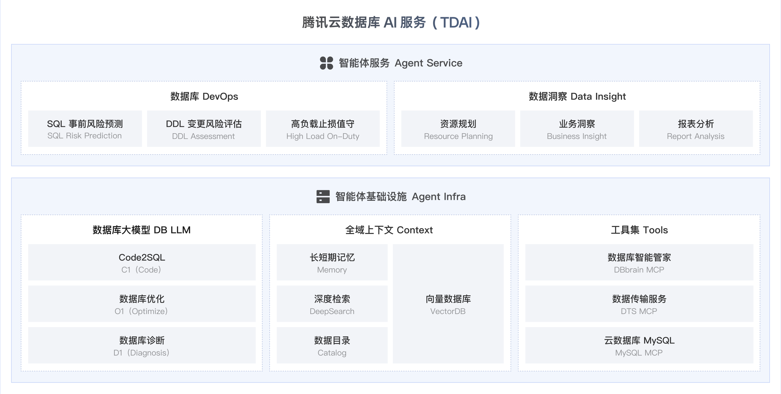 腾讯云数据库 AI 服务构建于智能体服务与智能体基础设施两大核心模块之上。智能体服务涵盖数据库 DevOps 与数据洞察,提供风险 SQL 治理、企业资源智能规划等能力;智能体基础设施层依托自研数据库大模型(DB LLM)、全域上下文(Context)与工具集(Tools),为企业智能体提供专属垂类模型、私域数据基座,助力企业智能跃迁。